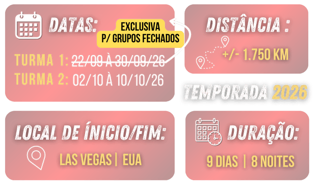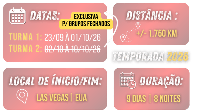 Prepare-se para a aventura definitiva que une a nostalgia da estrada à grandiosidade da natureza. Nosso tour “Rota 66 & Parks” é uma imersão no coração dos Estados Unidos, feita para quem busca emoção e paisagens inesquecíveis.